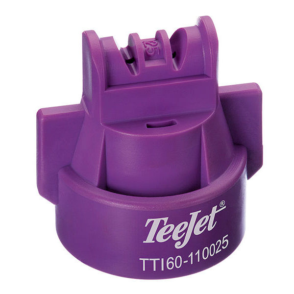 TEEJET TTI60-110025VP, SIZE 025 TURBO TEEJET INDUCTION TWINJET SPRAY TIP NOZZLE VIOLET. 0.25 GPM AT 40 PSI, 110° SPRAY ANGLE, 60° BETWEEN LEADING & TRAILING SPRAY PATTERNS, 20-100 PSI RANGE, POLY ACETAL CONSTRUCTION.