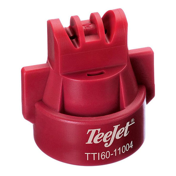 TEEJET TTI60-11004VP, SIZE 04 TURBO TEEJET INDUCTION TWINJET SPRAY TIP NOZZLE RED. 0.40 GPM AT 40 PSI, 110° SPRAY ANGLE, 60° BETWEEN LEADING & TRAILING SPRAY PATTERNS, 20-100 PSI RANGE, POLY ACETAL CONSTRUCTION.