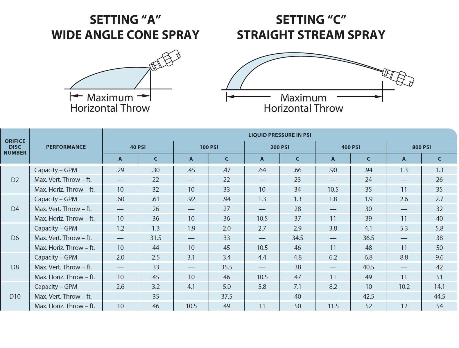 SEE CHART FOR MORE INFO. TEEJET AA143-AL-GH6, ALUMINUM TWIST-HANDLE GUNJET, #6 TIP, 30-800 OPERATING PSI, (F) GARDENHOSE THREAD INLET. 22-1/4" OVERALL LENGTH, 1-1/4 LB APPROX WEIGHT.